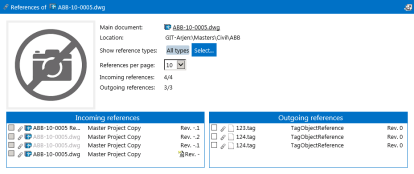 References to the selected document are listed in the Incoming references panel. References from the selected document to other documents are listed in the Outgoing references panel. To the right of each document name is an icon that shows the document's status and the revision number of the document.