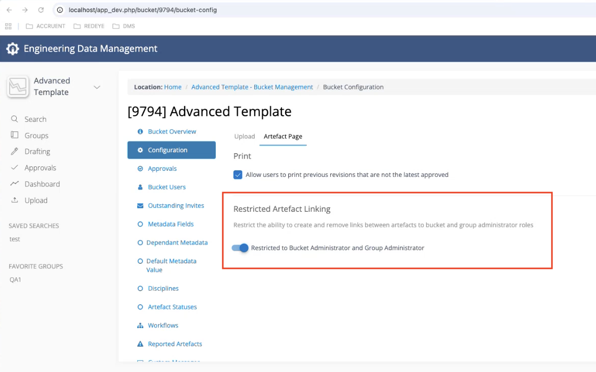 Bucket Administrators control linking permissions using the Restrict Artefact Linking setting in Manage Bucket > Configuration. This setting controls access to Link to primary, Cross-link to all, and Remove link actions.