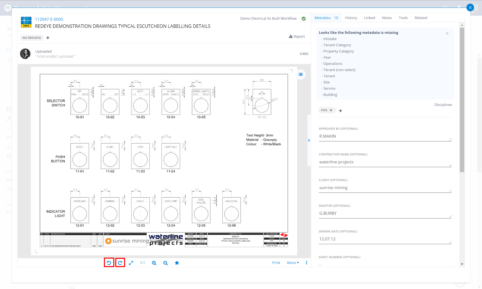 Sometimes a Drawing Artefact may be uploaded in the incorrect orientation. You can quickly fix it from the Artefact Page using the Rotate buttons in the View Controller tools.